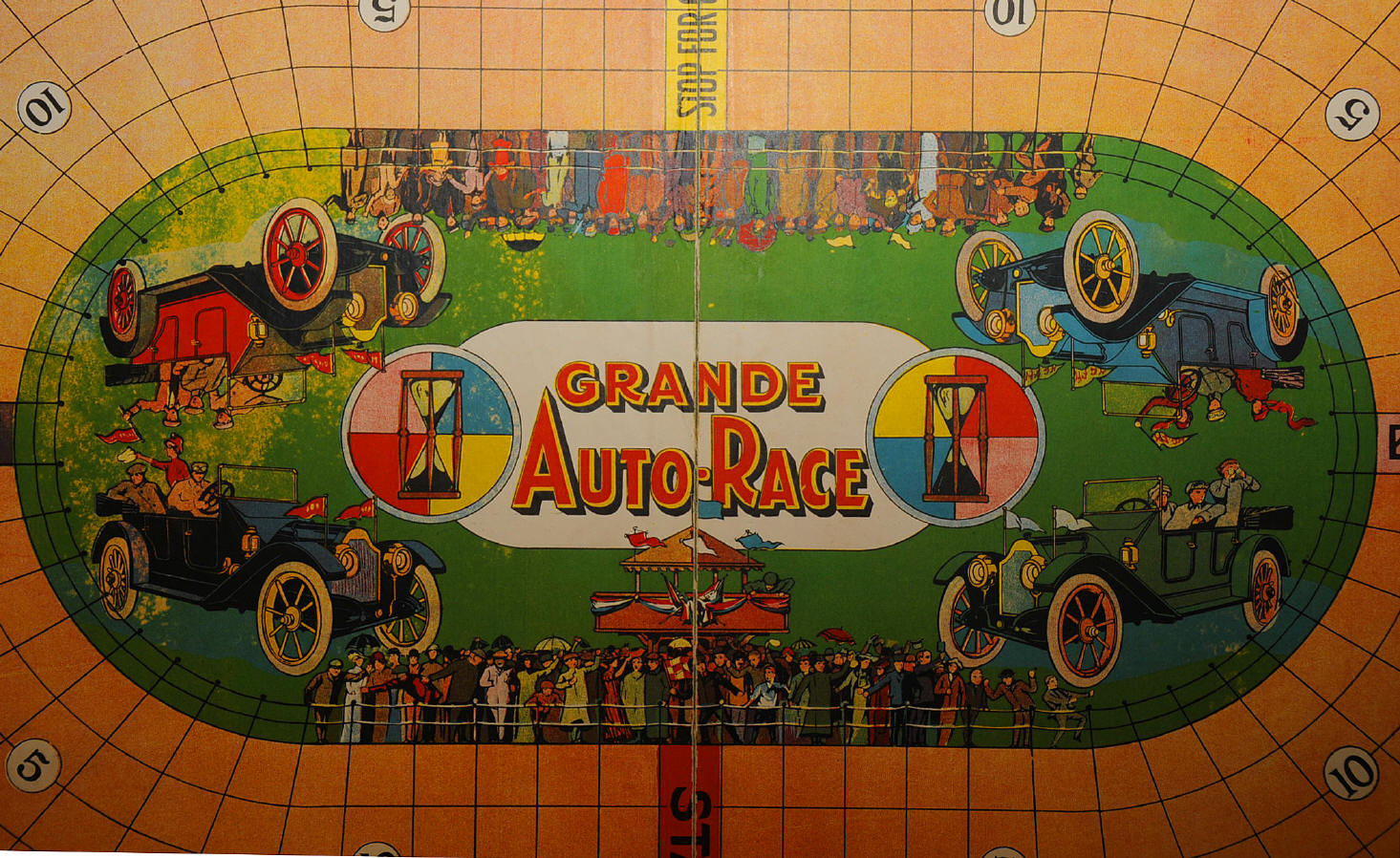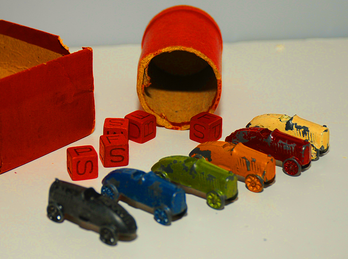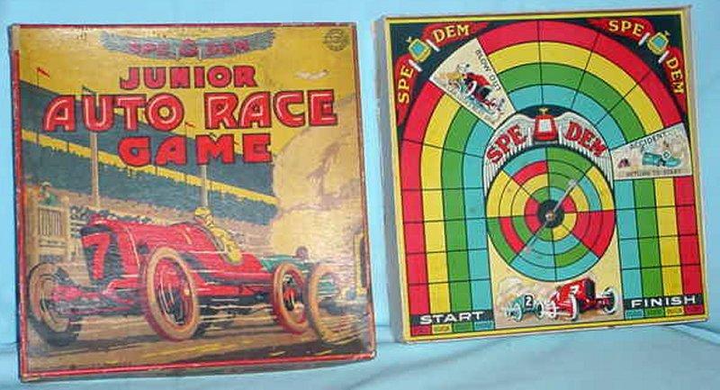 RARE: 1926 "GRAND AUTO RACE" GAME BOARD WITH METAL RACE CARSThe 1926 Grand Auto Race Game board by All Fair Games, Alderman, Fairchild Co. Churchville, N.Y. The front of the game board is a large 24" x 15" with a vertical folding cloth hing is in fantastic shape with clear vintage graphics and bright coloring. A rare find in this condition. What is more amazing it has its 6 colorful metal racing cars [1 3/4" l x 1/2" w x 3/4'h] each embossed with the name of car on back.. FORD ~ MAXWELL ~ DODGE ~ PAIGE ~ BUICK & SAXON. + A Dice cup with 5 wooden dice marked with letters. The All-Fair Toys Red box containing the game pieces is in poor shape with cover torn and missing some areas. The board lies flat ~ the back side shows the label and has fair/poor shelf ware. Photos and article courtesy of Bill Triola |
