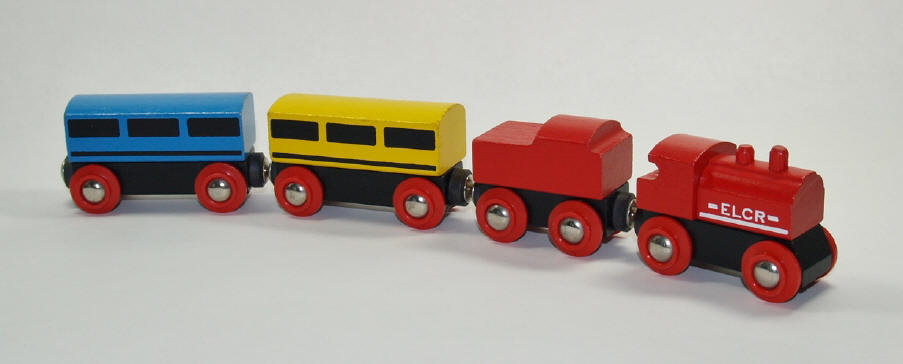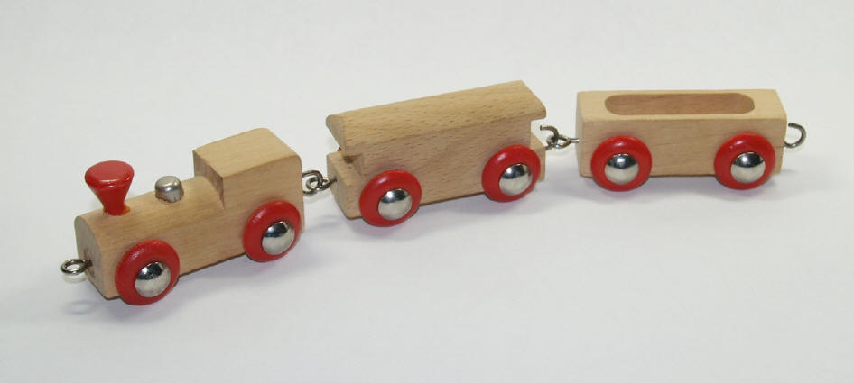 attach the wooden wheels ... and metal hook-eye couplers were used to link the