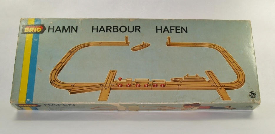 BRIO Harbour Set From my earliest days as a wood train collector, I realized there was not a great deal of readily available historical information about these great toys. So I became a self-professed researcher, as well as collector. Not only did I want to determine which trains to look for, I also wanted to gather information that was historically accurate. As a result, I have been searching for catalogs, ads, articles and other ephemera as diligently as I search for the trains. While owning a catalog is not nearly as much fun as owning a vintage train, knowledge is its own reward, as they say. Luckily, one of the first catalogs I found was a BRIO dealer’s catalog from 1964. I took a great deal of time “digesting” all the information it contained. Top on my list of “must-have” toys from this catalog was a train included with the 31405/40 Harbour Set. This particular train is unusual because of its natural wood finish. Only the wheels and smokestack were painted. In the opening pages of catalog, BRIO states that “children love clear, clean colours” and “children have a love of contrasts”. All of which makes one curious why BRIO chose to use so little paint on one of their largest sets. So I made a mental note in capital letters … “FIND THIS TRAIN”. However, after 7 years of futile searching, the mental note had become covered in cobwebs. I never saw one … never saw photos of one … never saw any identifiable individual components of one. But recently I was not only able to find photos of this set … I was able to add the set to my collection. (Proof that patience IS a virtue in collecting!) As you can see, the train is quite elegant and attractive in its “natural” finish. It’s certainly a “contrast” from the brightly colored trains and vehicles usually associated with the BRIO brand. According to my catalog archives, there appears to be several pieces that were only found in this set … such as the little lighthouses and wharf tracks. However, BRIO has a way of cleverly repurposing some items, so it wouldn’t surprise me that they showed up in other sets … or other toys. The train itself was not available for separate sale at the time, but the 2 ships could be purchased as part of a 3-piece set that also included a barge.