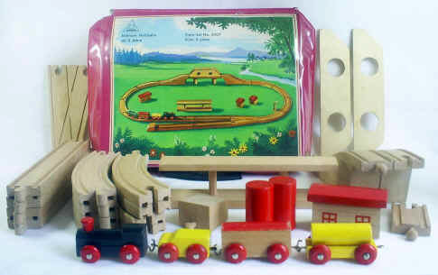 introduced railway sets with unpainted (natural wood) trains and accessories. Interestingly,