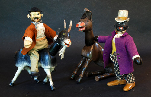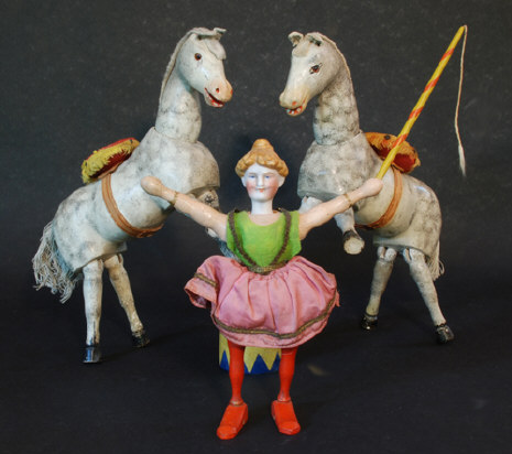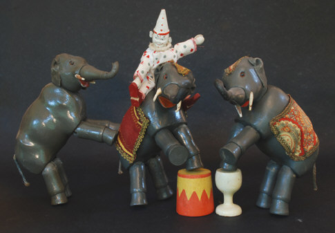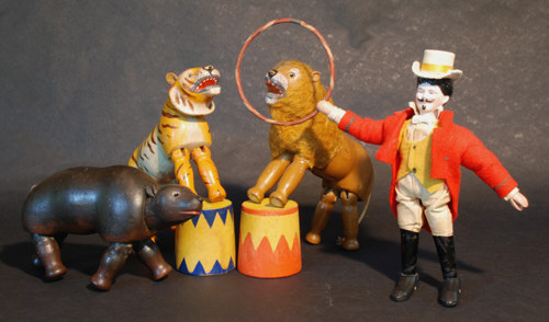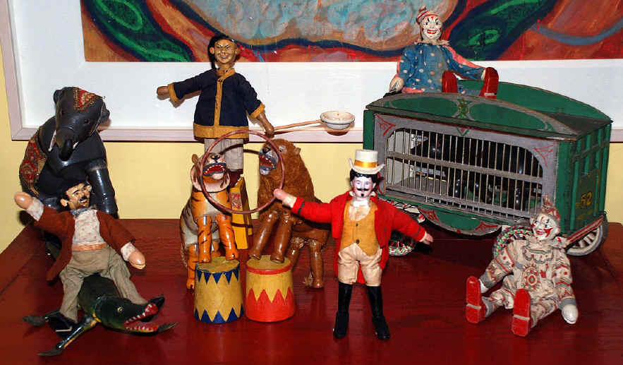 Presented for your viewing pleasure are photos of the Humpty Dumpty circus of Dr. Gene Metcalf, professor of American folk art at Miami University in Ohio. Gene teaches about American folk art and toys, and the phenomenon of collecting them. Gene once assembled a great collection of toy ray guns. His collection can be seen at http://www.toyraygun.com He wrote a book about toy ray guns called RAYGUN. Years ago, he sold his collection to magician David Copperfield and now he collects the Schoenhut Humpty Dumpty circus. Encouraged by us, Gene has taken an interest in photographing his collection for this Web site. Enjoy his beautiful interpretation of his Humpty Dumpty circus. |