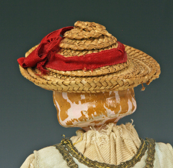 felt. Hat is red felt over a cone. Face condition is worn mainly around his