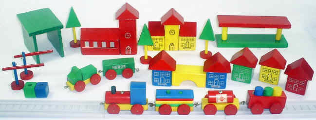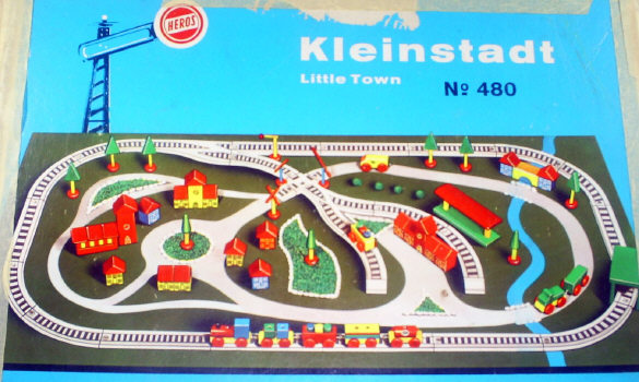 … and devoted a portion of the company’s factory to these products. In 1908, Rossberg assigned the milling company to his sons Carl and Hermann. The younger Carl continued to operate the milling business, while Hermann took over and enlarged the toy factory. By 1948, Hermann had trademarked the “HEROS” name, and had continuously improved and expanded the toy company’s product line. HEROS’ toy line included building blocks, games, puzzles, educational toys and construction sets. HEROS first began making train sets in 1968. These early trains … like the example pictured here … had metal hook-eye couplers, flat-disk wooden wheels and flexible, grey plastic track. As indicated by the box art photo, most sets came with a variety of brightly painted wooden accessories including cars and trucks, block-type buildings, tunnels, trees and station platforms. HEROS’ “kleinstadts” (little towns) could be arranged in an almost endless number of ways ... providing new play experiences day after day. The catalog shown here dates from 1971-72 and comes to us directly from the Rossberg company archives.