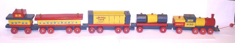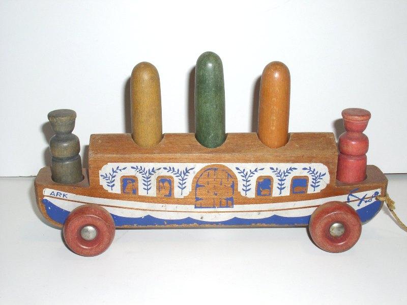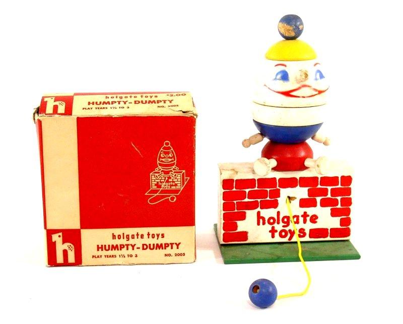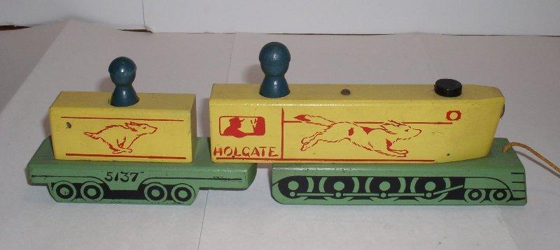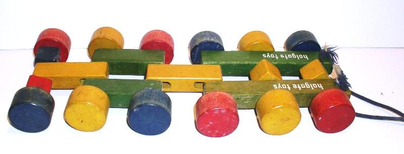 Brothers Company Kane, Pennsylvania 1789 (woodworking), 1929 (started making toys) According to the Holgate Toy Company history on their web page, Holgate can trace back their company to its founding in 1789. The web page also shared, “In 1929, Holgate was one of the first toy companies in the U.S. to research and develop the educational, preschool toy market for children. Holgate worked closely with the early educators in the emerging Kindergarten program to develop safe, educational toys that had play value.” Holgate toys are simple in design, near indestructible, and are mass produced. Vintage Holgate toys are common in the resale market. Holgate vintage toys have their strongest value when there are sets, when all of the parts are with the toy, and/or when the toy makes a strong visual display. |