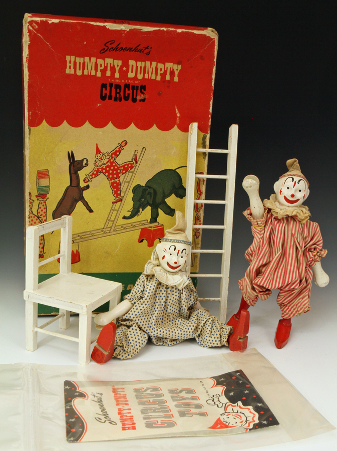 1950. Two clowns in nice shape along with their box, chair, ladder and