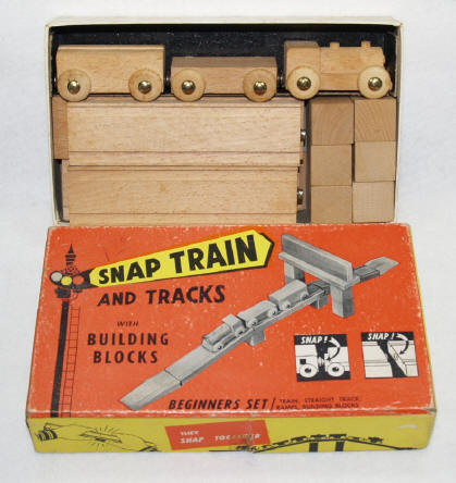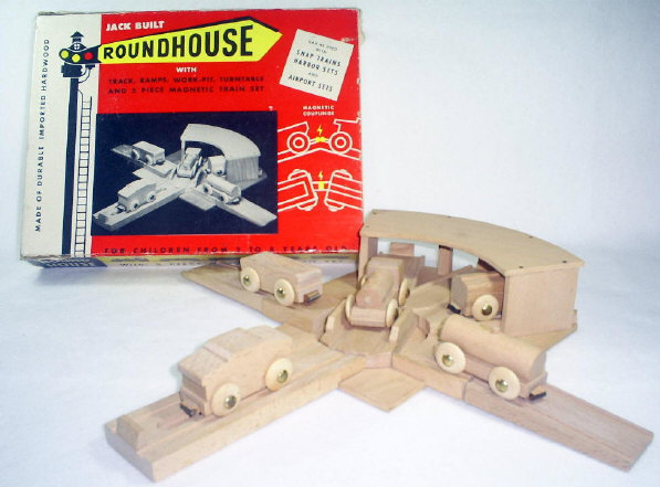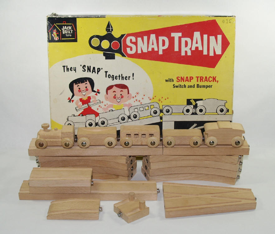 Jack Built Toy Manufacturing Company The Jack Built Toy Co. of Los Angeles CA was a very prolific producer of wooden railway sets and other toys during the 1950’s and early 1960’s. They are most remembered for their “Snap Train” line of wood toy products. The company offices were located at various times in LA and Burbank, and they maintained a showroom/sales office in New York. Most … perhaps all … of their wooden railway sets were manufactured in Japan. JB’s snap trains look very similar to the trains made by Skaneateles Handicrafters. They were identical in size, had wooden wheels affixed by round-head tacks and had a natural wood finish. Perhaps it could be said that snap trains were a tad more sculptural in design. JB