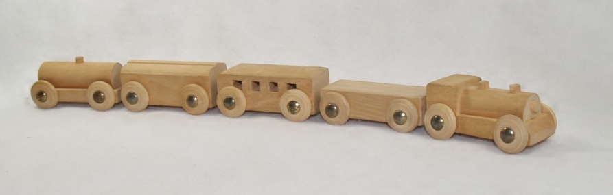JB’s hardwood trains, tracks and accessories were well-made and durable. Hardwood blocks of various shapes and sizes were also included in many of the sets. Child safety was apparently a high priority for the company. As their catalog stated, a JB train set provides “train fun that does not need adult supervision and eliminates the hazards of electricity”. The company also produced a dizzying array of accessories including a water tower, trestle, tunnel, station platform, signal signs, telegraph poles and a roundhouse with movable turntable. In addition, dozens of different vehicles were available including a snazzy convertible, tank truck, beverage truck, double-deck bus, bulldozer, steamroller and a cab-over truck with an unusually long flatbed trailer. JB also made airport and harbor sets that could be used in conjunction with their railway sets. In