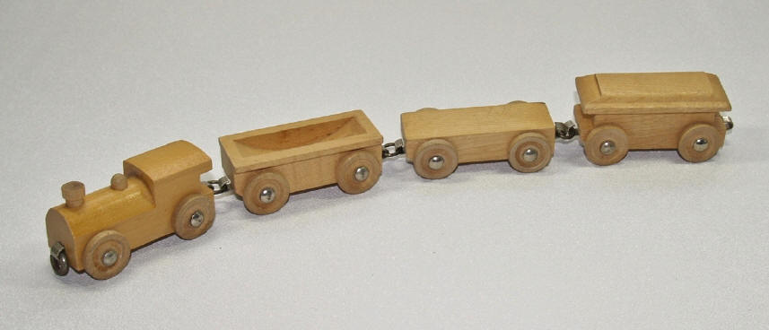 actually produced a wide range of products. The first Keystone train set pictured here (ca. 1950-51) is probably one of the company’s earliest attempts at making this type of toy. It clearly had some rather curious design “idiosyncrasies”. The train is wonderfully crafted from hardwood. It has a very attractive, quasi-realistic design and a lightly varnished, natural wood finish. Single-piece, flat metal hooks run through a cavity beneath each car, and are retained in place by the thick metal axles. But the metal rings used to link the trains, pop off the hooks rather easily. (When this set arrived in the mail, one of the rings was already floating loose in the box.) These pill-sized rings were probably prone to being lost … or worse … being swallowed. In addition, the track appears to be made from styrene plastic. Unfortunately, this is the same type of hard, brittle plastic used in making model cars, boats and airplanes. Track breakage … particularly connectors … probably occurred at a rather alarming rate during “vigorous play”. One could also question the durability of the thin wooden wheels. The second Keystone train set pictured here (ca. 1952-56) shows several design differences compared to the earlier set. The trains now had one-piece hook-eye couplers, and the wooden wheels were made significantly thicker. However, the train design itself was more simplistic … not as sculptural as the earlier set. These later trains were finished in bright, glossy paints, rather than the natural wood finish of the early train. Also,