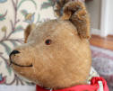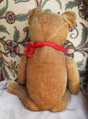Straw stuffed bear - appraised as made by Ideal Early 1900s Mohair loss all over but still clean looking. Arms articulate - legs do not. $500 |