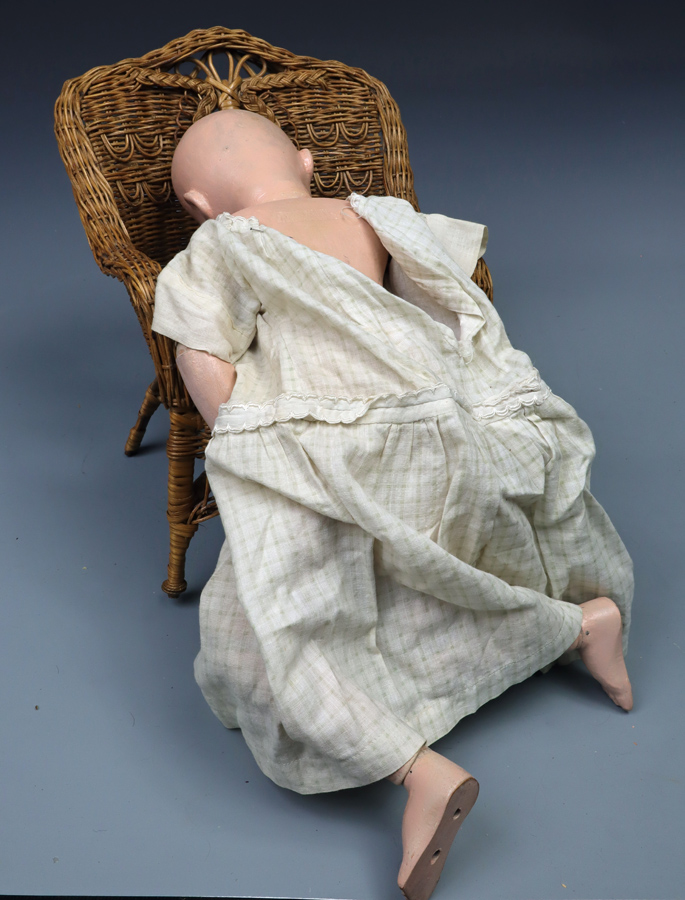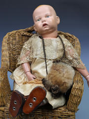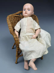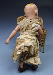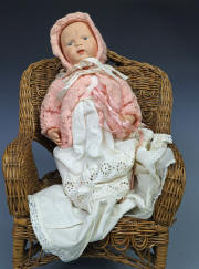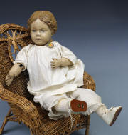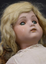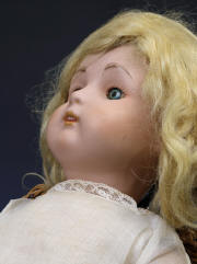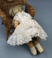 | TD19-D | Appears to me to be a 300 series doll, possibly a 14/ 312. 15 inches tall. Original wig. All joints are sound. Face in fair condition with cracks. Eyebrows repainted. Dress, shoes and undergarments are modern. $240 Sold |