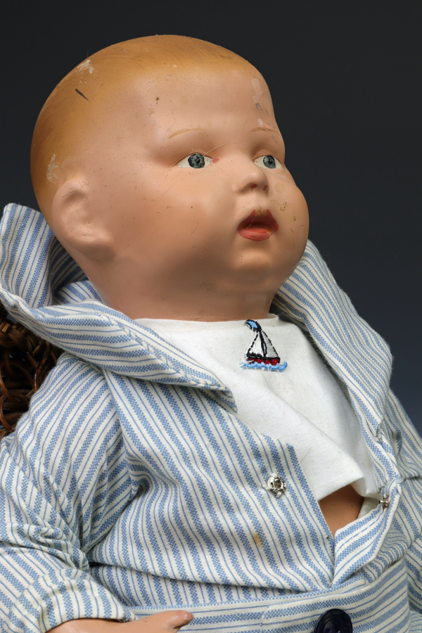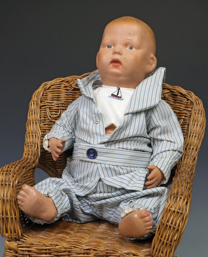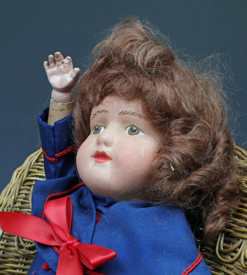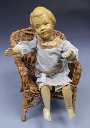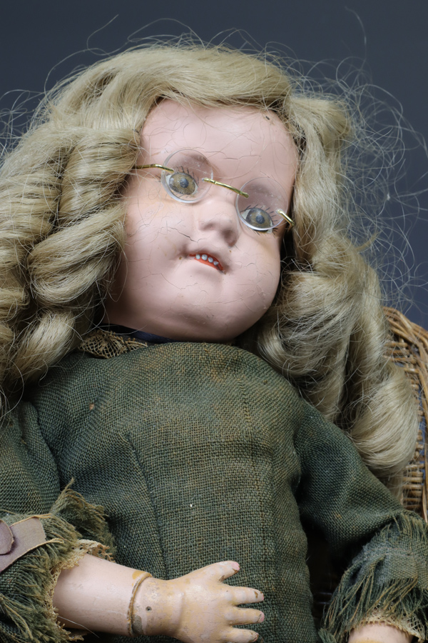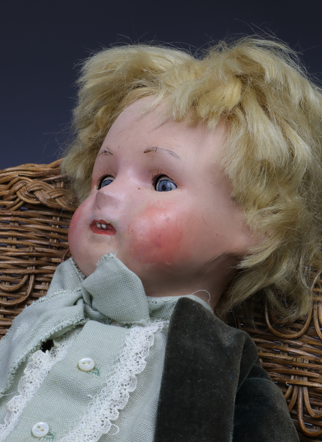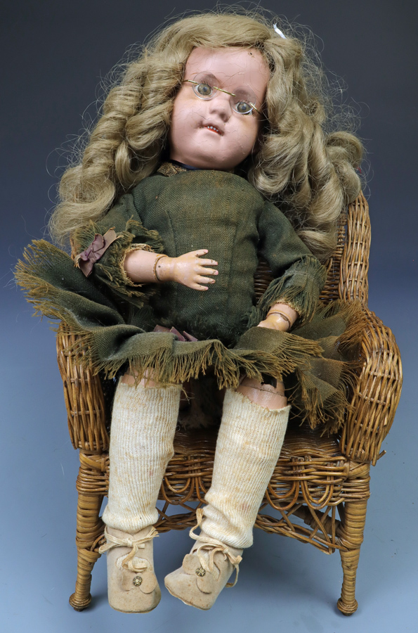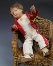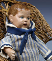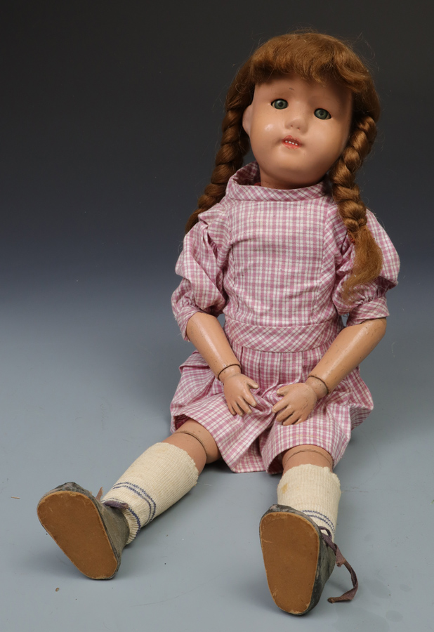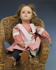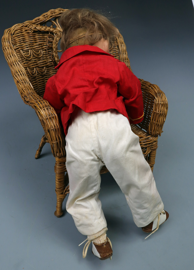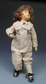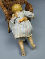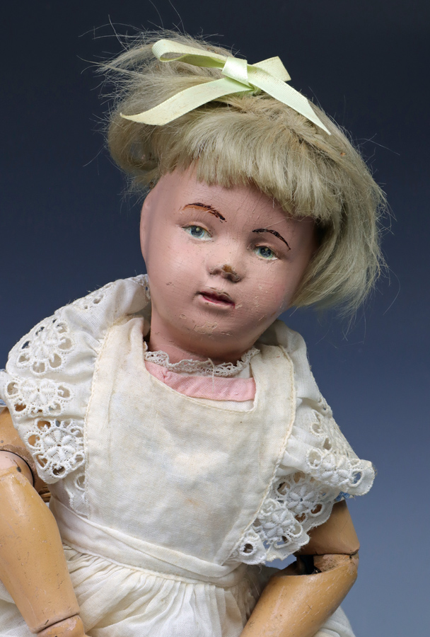 | TD19-M | Face appears repainted. Wig and dress and shoes new. Right leg and left arm are not Schoenhut. Sold |
