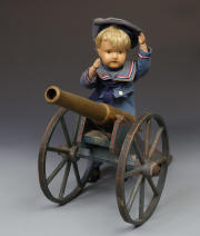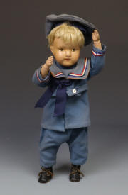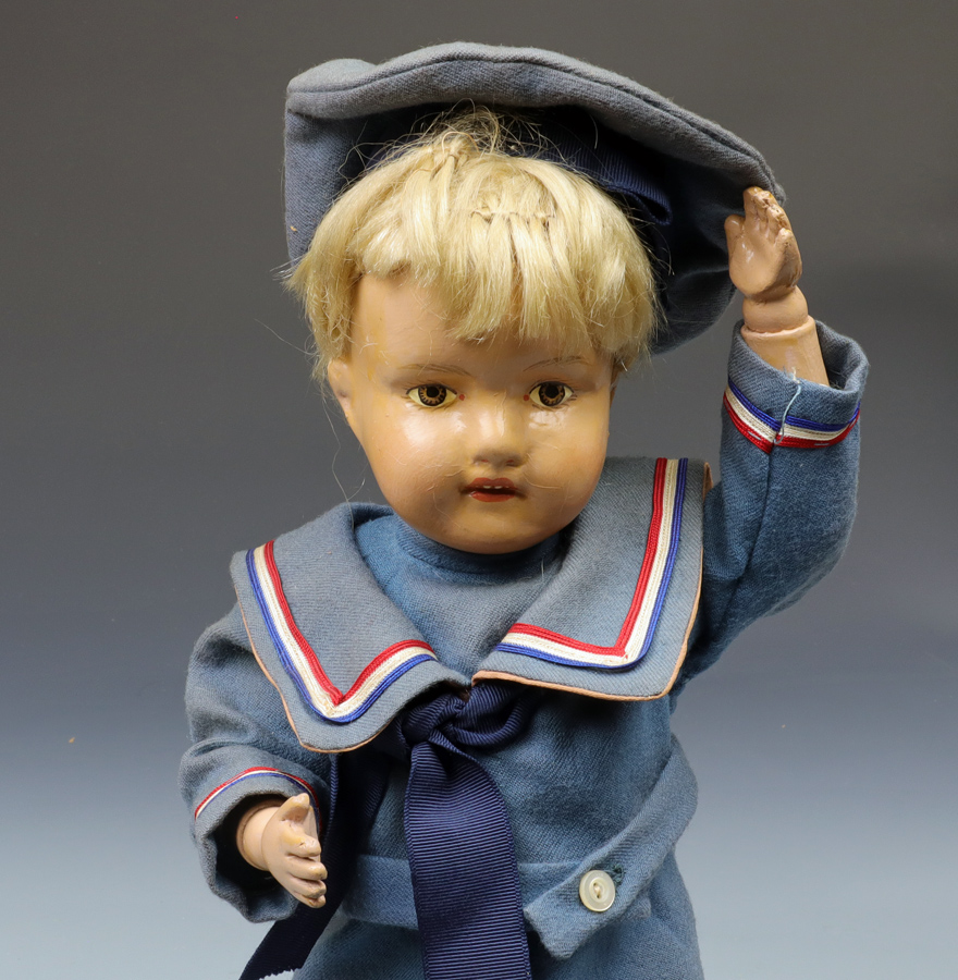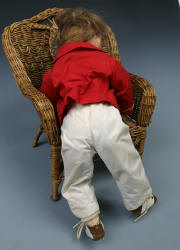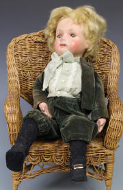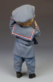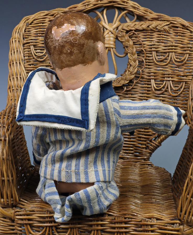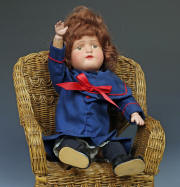 | TD19-Q | Little boy doll - 11 1/2 inches tall. Looks like an old repaint over entire head. New, nice suit. Mechanically sound. $80 Sold |
