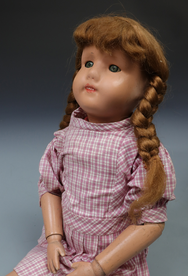 | TD19-U | Girl doll - 17 inches. Sleep eyes work . Appears to be original paint but in poor condition. Replaced wig. New dress Might be original shoes but with replaced soles. Decal on back. $100 Sold |