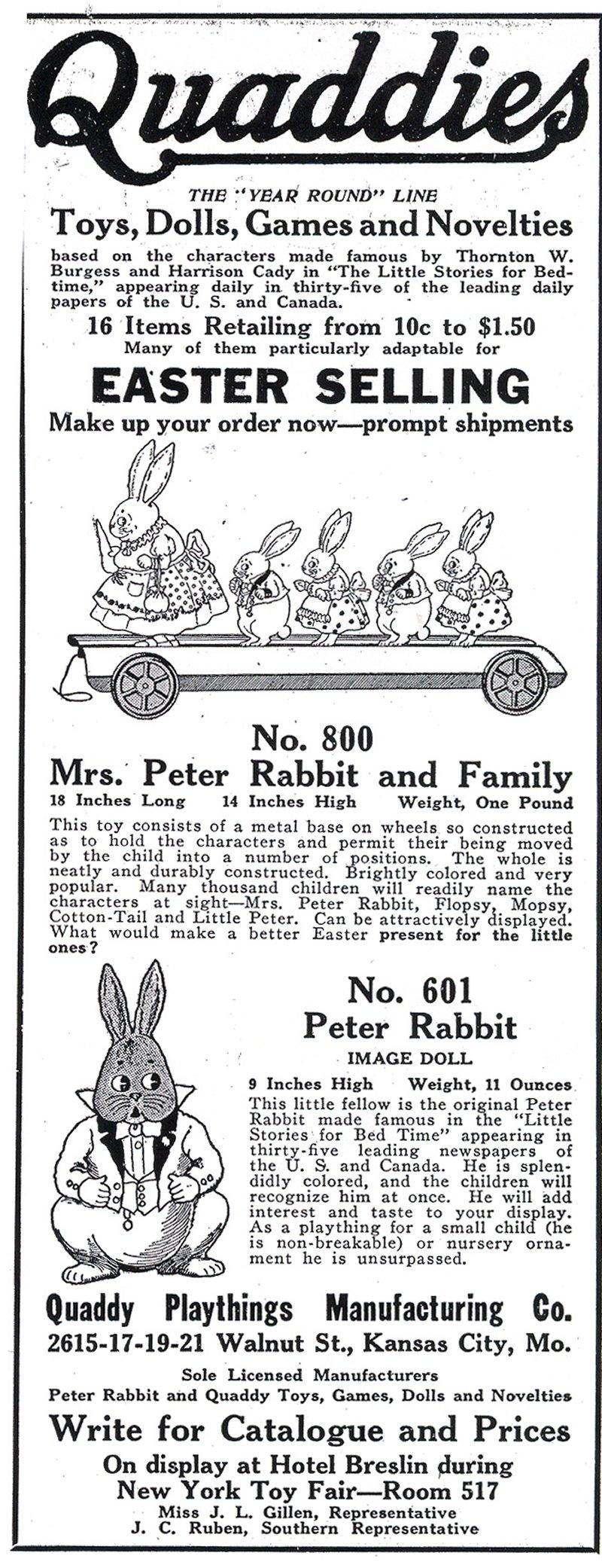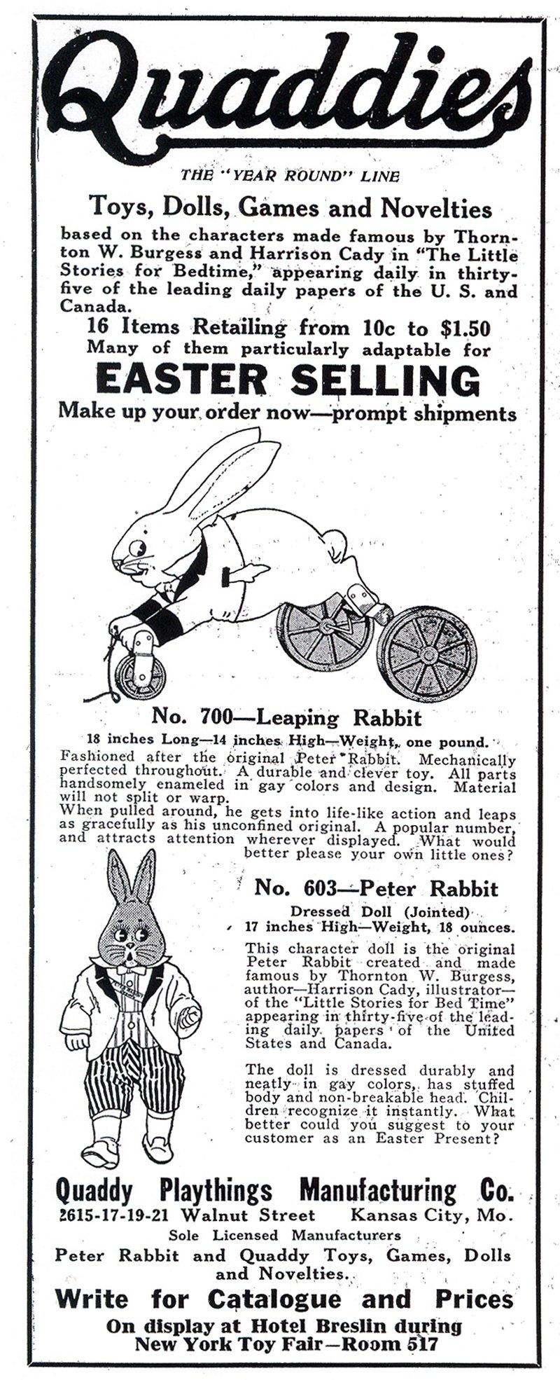 | Quaddy Playthings Manufacturing Company Kansas City, Missouri Estimated 1917 - 1920 The Quaddy Playthings Manufacturing Company’s toy design specialized in toys based on the characters in Thornton W. Burgess’ Little Stories for Bedtime. Quaddy produced three Peter Rabbit pull toys with artwork by Harrison Cady, the famous artist of Burgess’ books. We could only find reference to Quaddy Playthings until 1920. |