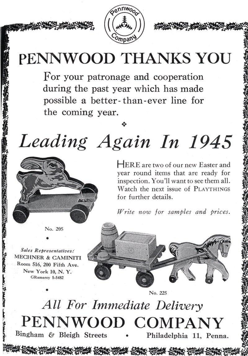 ![]() 1945 Advertisement Rabbit: $45 - $60 Horse and Wagon: $90 - $120 |