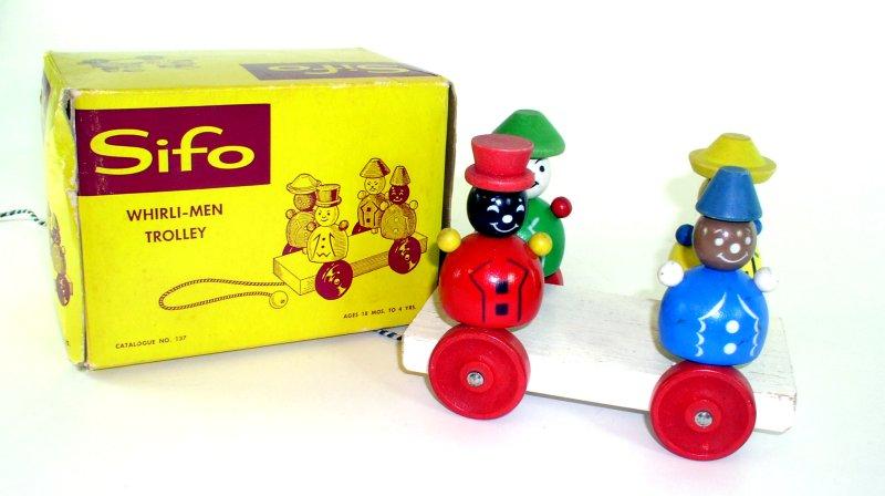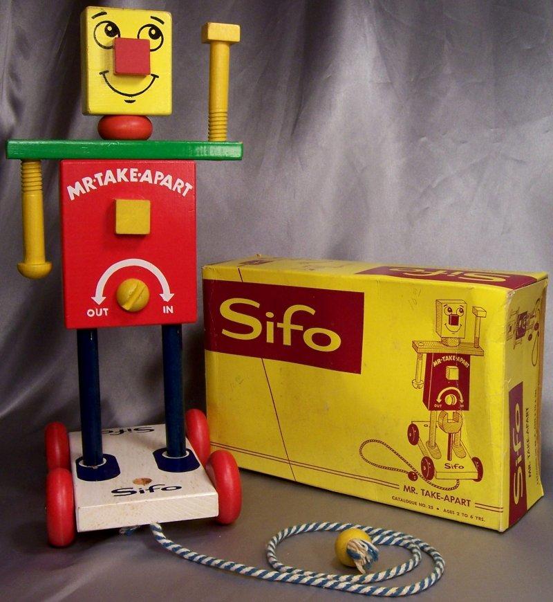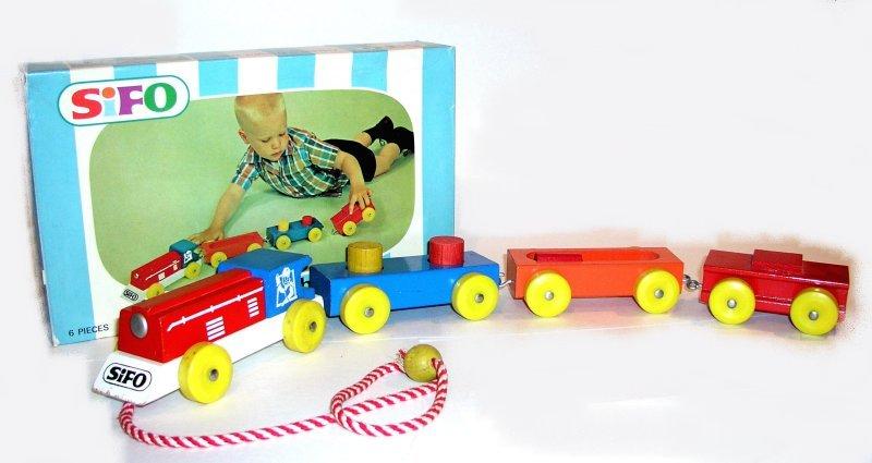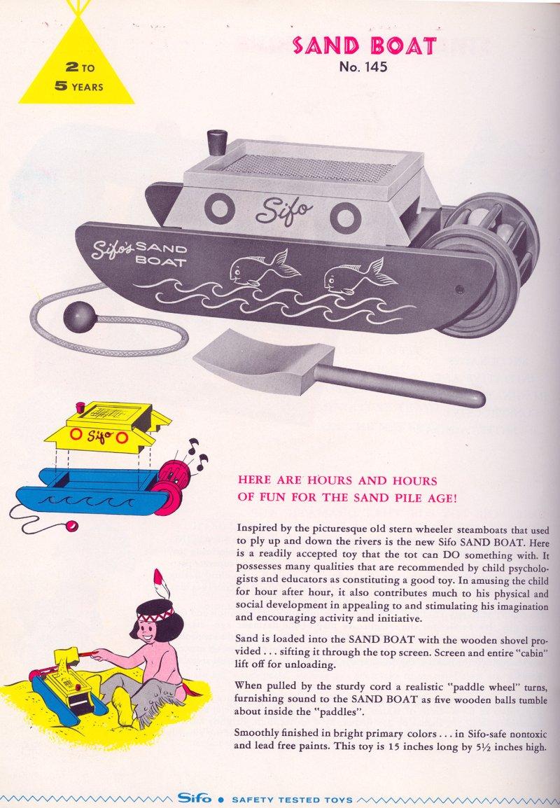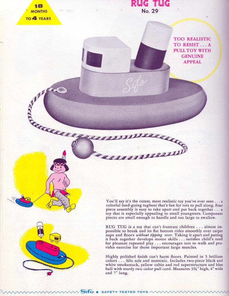 | Sifo Company A.K.A. The Sifo Novelty Company Norway, Michigan St. Paul, Minnesota 1944 - 1975 Sifo toys were designed to help children build their bodies by simple exercise, their minds through solving simple problems and providing necessary recreation, their motor and mechanical skills through trial and error, repetition and use of memory. They advertised that their wood was cut and sawed in their Norway, Michigan plant which was then sent to St. Paul to be finished. Sifo produced several different pull toys. The good news is that they are always marked with the Sifo name. We have included only a fraction of their toys for reference. |
