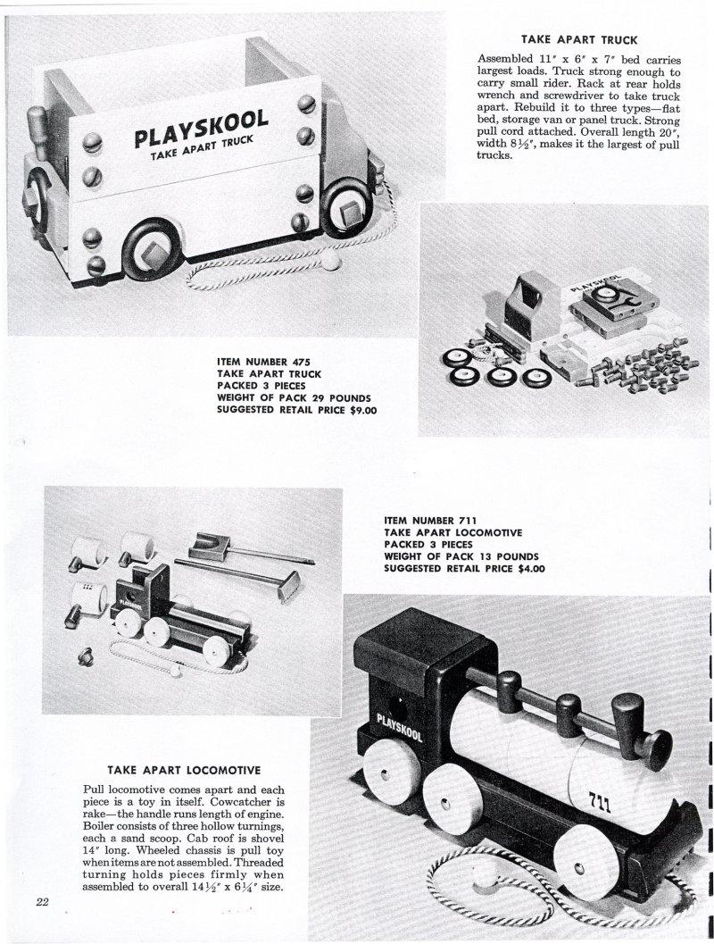 ![]() 1958 Catalog Take Apart Truck: $30 - $40 Take Apart Locomotive: $30 - $40 |