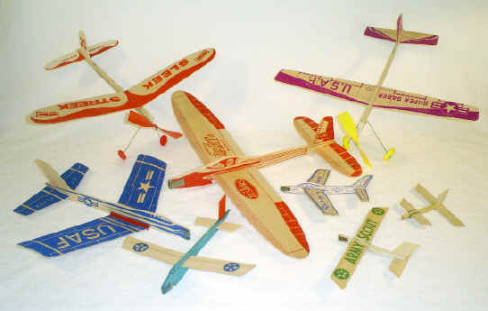 In 1953, the Paul K.Guillow Co. introduced the Jetfire glider, which was the first of its type to be mass-produced and packaged in high-speed machinery. This allowed Guillow to meet the production quantity and unit price demands of the now-flourishing “chain stores”. The mass-marketing success of Guillow and a slowing economy spelled the end for many of the smaller companies in the 1950’s and 60’s. Some, like American Junior Aircraft, North Pacific and Comet disappeared into larger companies. Others just disappeared. By the 1970’s, only a few players were left in the game. Currently, Guillow is the dominant manufacturer of wooden toy gliders in the US. This is understandable in my view, since they are the most akin to the gliders of the distant past. Kids can fly ‘em right out of the package … or learn the intricacies of modification and trimming for increased performance. Several other companies produce flying toy airplanes using plastic and foam, but their flight performance and durability are … to put it kindly … disappointing. Likewise, contemporary laser-cut wood gliders from Asia also seem to “miss the mark” on quality and “fly-ability” in my view. In this era of internet auctions and antique malls, vintage gliders can often be found if one is persistent. However, many gliders are now finding their way into collections verses being used as “toys” for a weekend’s flying fun … so prices are rising accordingly.