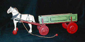 | Please contribute to this toy list. I am finding new items frequently. The list below is for those produced in Illinois. All are pull toys unless otherwise described. Value is my estimate of the likely EBAY selling price for excellent, complete samples. Click on the toy's name to see its illustration. | ||||||||||||||||||||||||