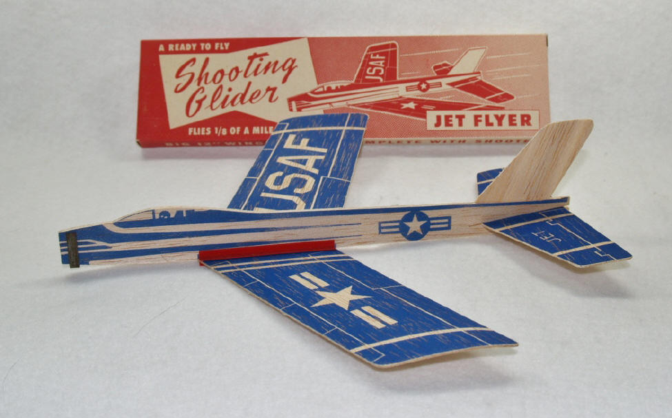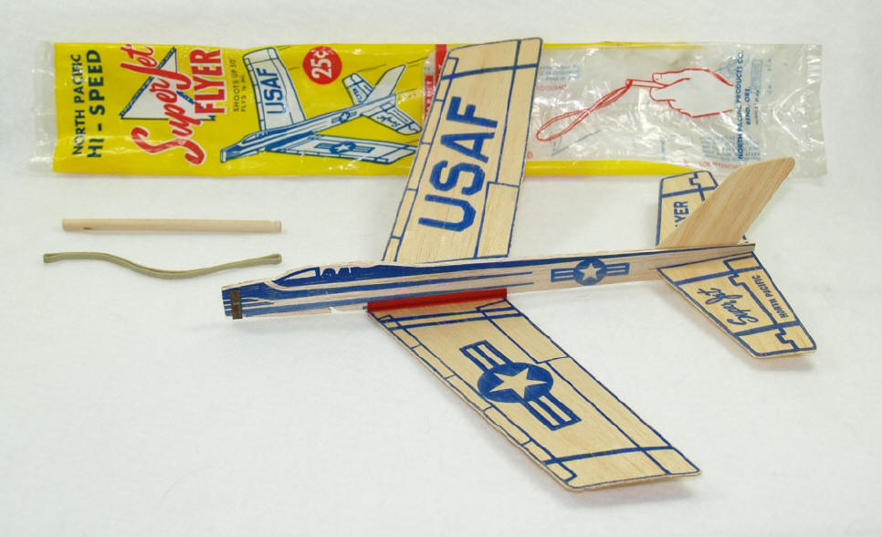 “Jet Flyer” catapult glider (ca 1950’s) – In my opinion, this sleek jet was the best looking glider that NP ever made ... although it was just “average” with respect to flying performance. Cleverly, the wing clip was used to attach the wings to the bottom of the fuselage rather than the top, as was customary with most NP planes. The 1960’s version of the Jet Flyer (now called the Super Jet Flyer) “reversed” the graphics on the wings … simple blue lines on natural wood. But the overall design was unchanged.