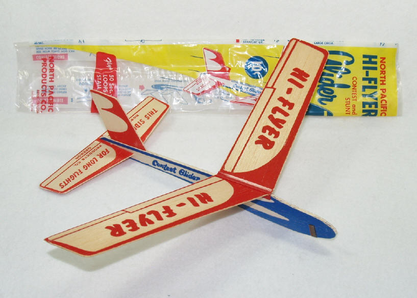 “Hi Flyer” toss glider (ca late 1950’s) - One could argue whether the Hi Flyer really had the “right stuff” to be a true contest glider as indicated in the fuselage graphics. But the glider certainly was a “looker” and had excellent performance for a dime. It was also a prime example how successful the NP folks were at “scaling up” their designs. The Hi Flyer was a much larger iteration of the little Strato. |
