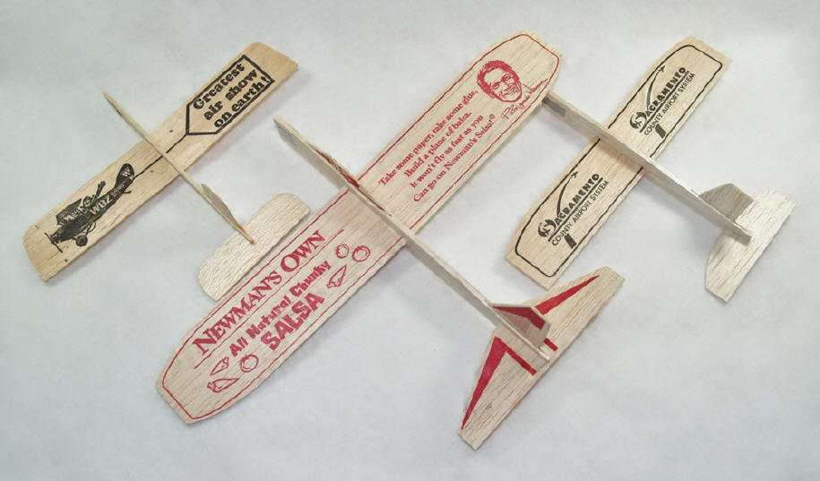 Wood Gliders in Advertising Soon after wood gliders began zooming through the skies, savvy marketing folks realized these toys could be used very effectively for advertising and promotional purposes. Just as today, it’s all about brand recognition and brand loyalty. Wood gliders not only have a universal appeal to kids as playthings … but also have a strong appeal to marketers as advertising tools aimed at parents wanting to keep their kids happy and entertained. Interestingly, many of the pre-war gliders I’ve found have some sort of “sponsor” printing on them. Perhaps during the pre-war years of widespread economic strife, toy manufacturers relied heavily on making promotional items of this type to keep employees busy and production lines open. If this “targeted advertising” put countless more gliders into the eager hands of youngsters, I’m good with that. (Note – some of the promo glider photos will be presented without comment.) This section is also dedicated to specialty items that don’t quite fit into the other glider categories. (You’ll never know what might show up here!) |