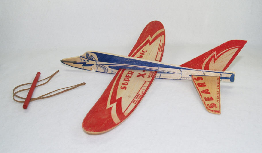 “Super Sonic X-8” (ca 1940’s) – This large and impressive catapult glider was made by the Superior Products Co of Wichita (KS) for the Sears Oil Co in the New York area. It has a beautifully crafted airfoil wing and wonderfully vibrant graphics. My research has not uncovered any details about the company as a model airplane or toy manufacturer. |