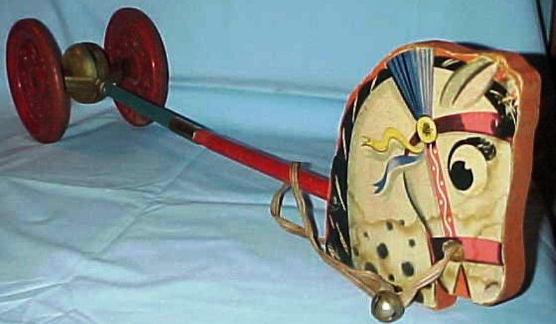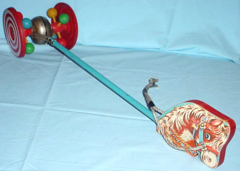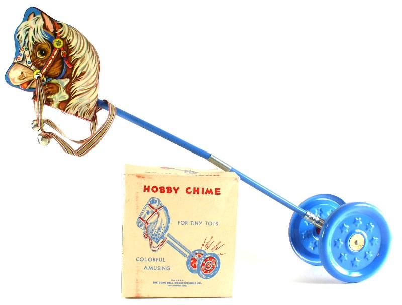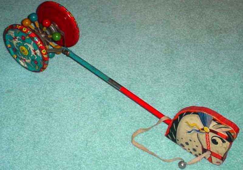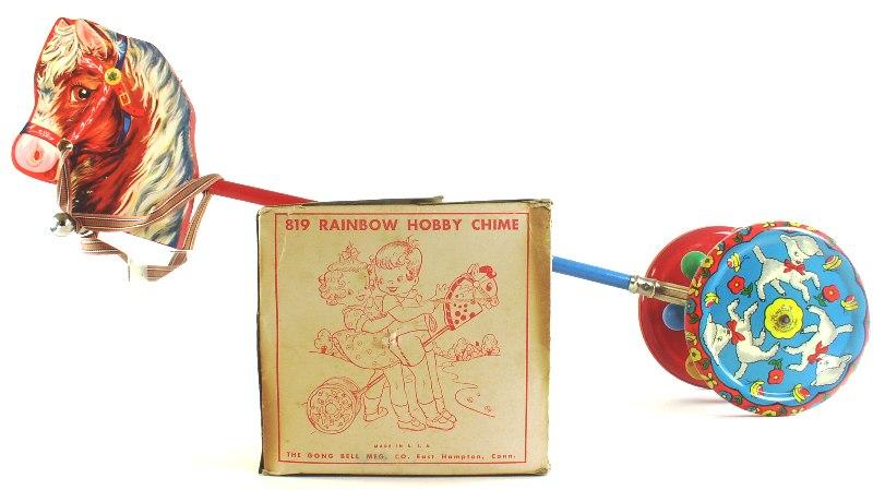 stick toys and pony stick toys made by Gong Bell in the 1930's to 1950's