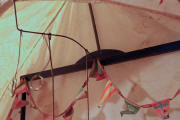 ![]() The tent has a curtain that drops, covering the front. The metal frame is showing some rust through