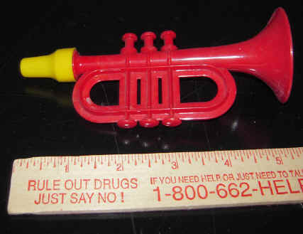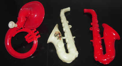 various plastic instruments (trumpets, horns, whistles, and kazoos)